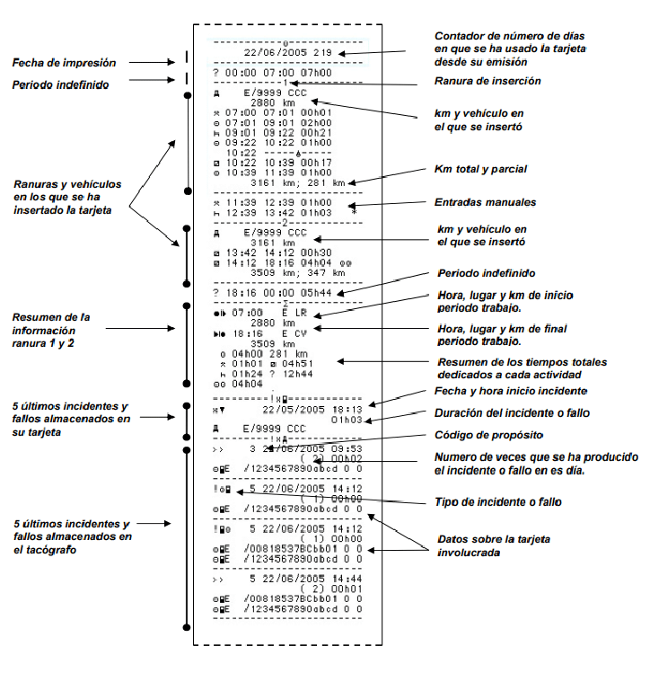 - Actividades diarias del conductor y segundo conductor registradas en las tarjetas. También se le llama “ticket 24 horas del conductor”. Es el que se imprime y debe llevarse encima al cambiar a un vehículo con tacógrafo analógico. Complementa a los discos en la información que les falta a estos.